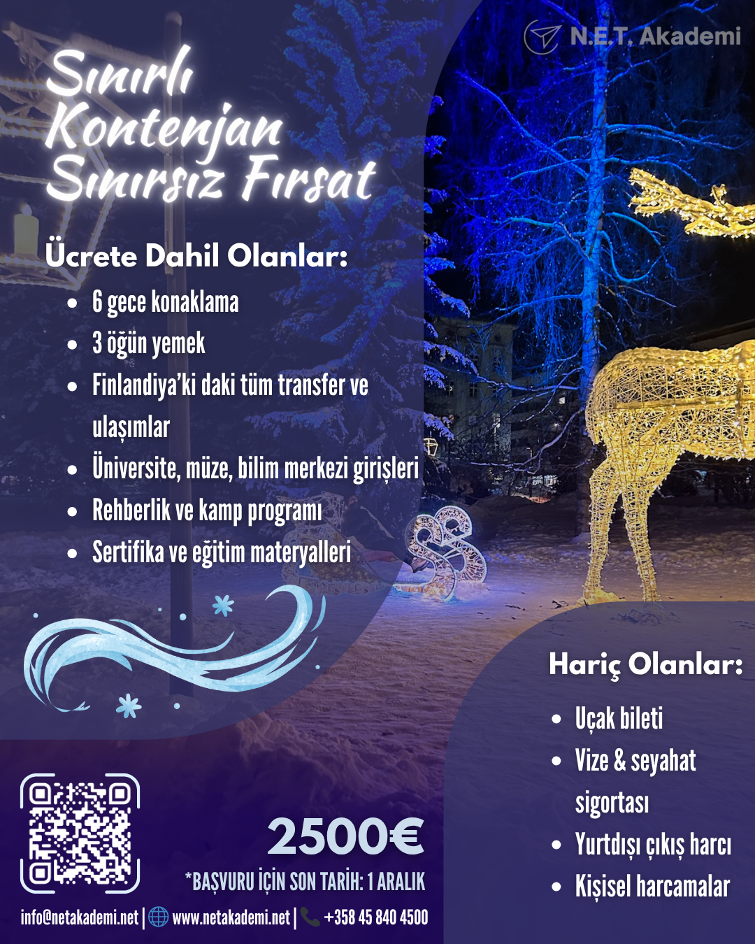 N.E.T. Akademi tarafından düzenlenen Finlandiya Bilim ve Doğa Kampı, öğrencilerin bilim, teknoloji, doğa ve girişimcilik alanlarında 21. yüzyıl becerilerini geliştirmelerini hedefleyen özel bir kış programıdır. Türkiye’den katılan gençlere Finlandiya’nın eğitim modeli, çevre bilinci ve bilimsel yaklaşımıyla global bir vizyon kazandırmayı amaçlar.